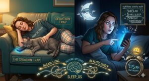 Cuando despierto, durante los primeros instantes intento convencerme de que sólo he cerrado los ojos un momento. Un minuto como mucho. Hasta que miro el reloj … y descubro que han pasado dos horas. Dos … horas … y además tengo el bordado del cojín tatuado en la mejilla, estoy mal doblada, con la nuca medio tiesa y preguntándome en que año y planeta estoy. Y es que, ese mismo “sistema operativo” llamado sueño, tan robusto y eficaz en el salón, tiene la curiosa habilidad de volverse frágil y paranoico cuando cae la noche. No siempre … pero lo suficiente. Especialmente en mitad de una noche cualquiera, sin previo aviso.